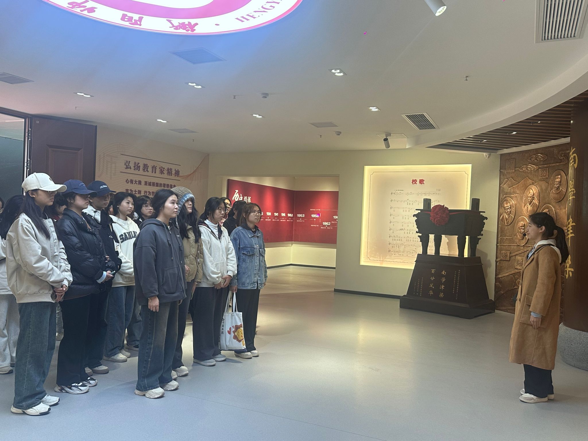 坐落在东校区的衡阳师范学院校史馆,是2024年建立的,以衡阳师范学院的发展历程为主,涵盖红色革命文化。走进衡阳师范学院校史馆,序厅的正前方是融合了红色文化、湖湘文化和师范文化的浮雕艺术墙。艺术墙左边由“石鼓七贤”和“船山先生”共8位人物像及“南学津梁”校门图构成,寓意学校沐浴着湖湘文化而诞生。正中间的场景画,还原了青年毛泽东在学校作题为《社会主义》演讲时的场景,彰显了学校作为湘南革命策源地的重要地位。
