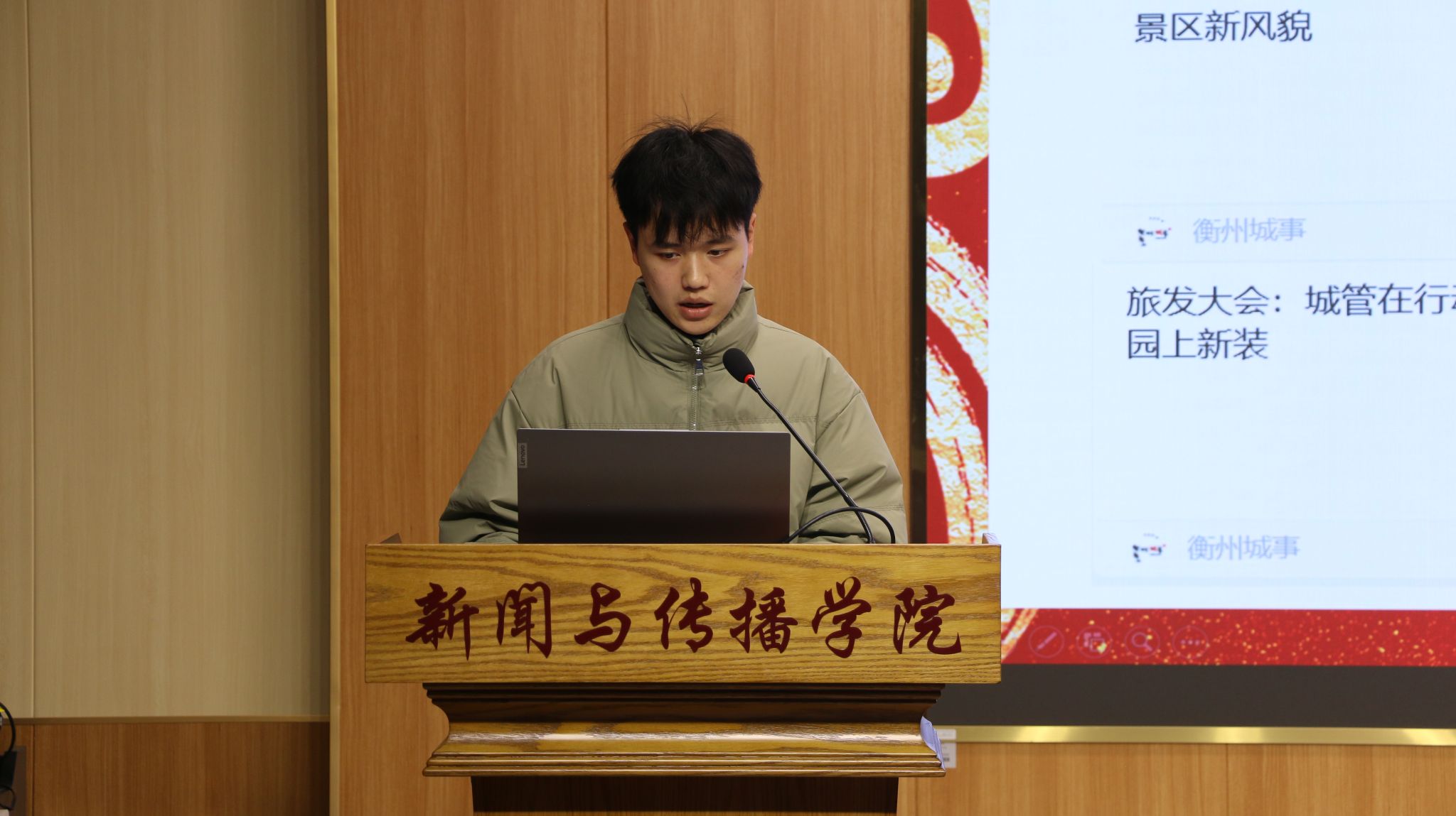 随后,各部门负责人上台进行部门总结。2024年影视部共参与40余次任务拍摄,推出30余件新闻作品,其中原创作品八件,包括发布在衡州城事的作品《视频|城管进行时|第三届湖南旅游发展大会“净美雁城,喜迎八方来客”》等;采编部共撰写超过52篇报道,22篇报道发布在衡师新传人上,超过20篇发布在衡州城事上,超过12篇发布在新湖南、红网、湖南日报等优秀省级媒体平台上;策划部近一年策划的活动主要有“春意盎然,绿意映像”摄影沙龙活动、衡阳师范学院第十七届主持人大赛决赛暨湖南省第二届大学生“新声奖”主持人大赛选拔赛、“恒分类 衡美好”衡阳市2024年垃圾分类知识竞赛、“致敬环卫 扮靓雁城”庆祝湖南省第二十九届环卫工人节晚会,并为衡东文旅设计了创意IP“戚侠”、“采侠”和文创周边,为垃圾分类知识竞赛设计了系列海报等。