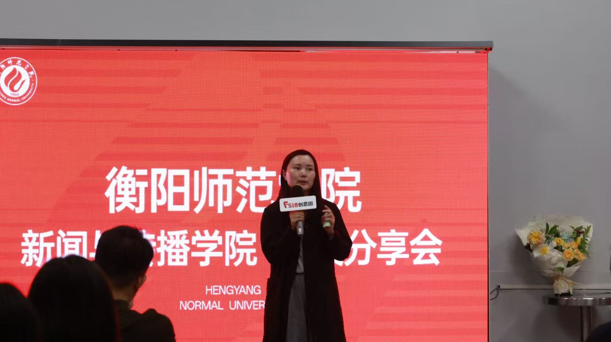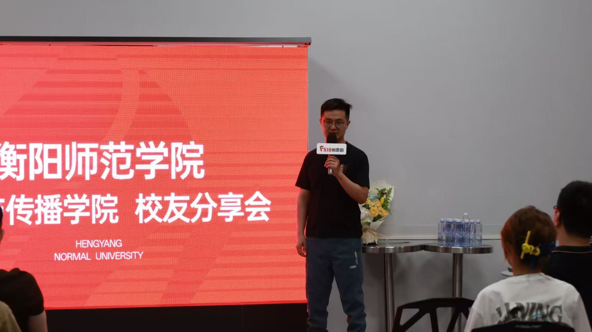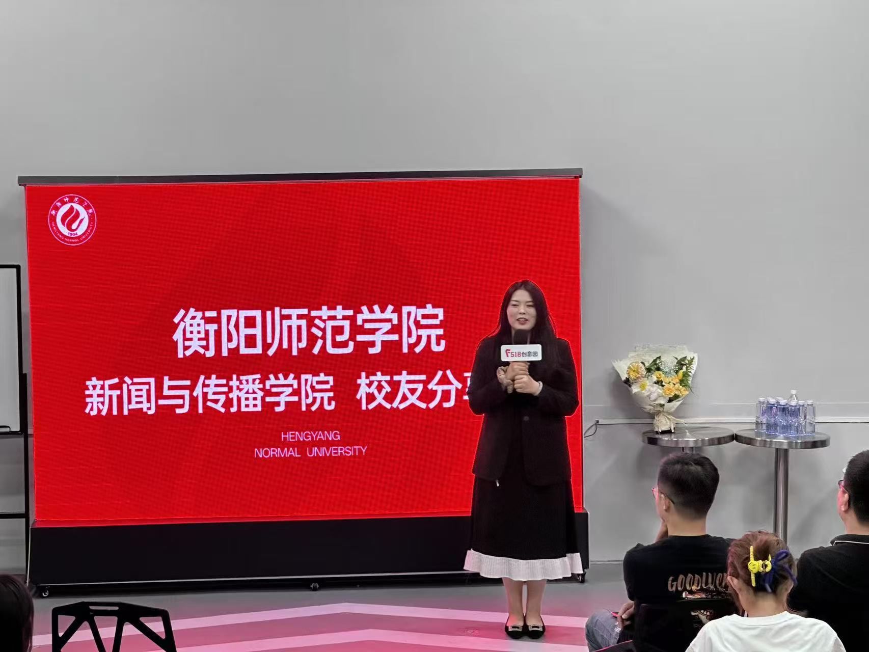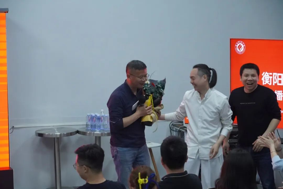 活动开场,学姐学长们为两位老师送上献花,现场气氛瞬间升温。