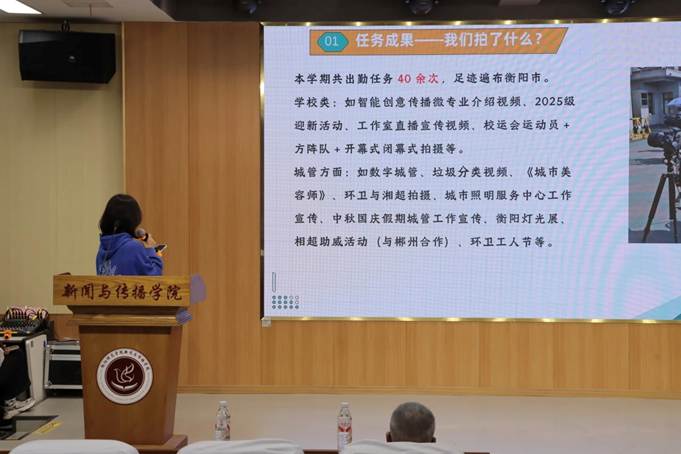 薪火传媒工作室主任喻雅琪对本部门今年所完成的工作进行复盘与汇报。采编部累计开展任务30余次,完成校内报道17次,在“衡师新传人”“衡州城事”“红网”“新湖南”等校内外平台发布稿件30余篇,多篇作品登上省级媒体,展现了扎实的文字功底与新闻敏感。影视部表现尤为亮眼,出勤任务40余次,发布作品33篇,覆盖“衡州城事”“衡师新传人”等平台,总阅读量突破1.5万。从校运会跟拍到《城市美容师》纪录片,从专业介绍视频到“湘超”助威活动,镜头始终对准校园活力与城市温度。策划设计部则在活动策划与视觉设计上持续发力,完成“关注赢好礼”系列活动4场,设计海报、易拉宝等宣传物料十余份,同步推出节气节日推文9篇,以创意赋能内容传播。