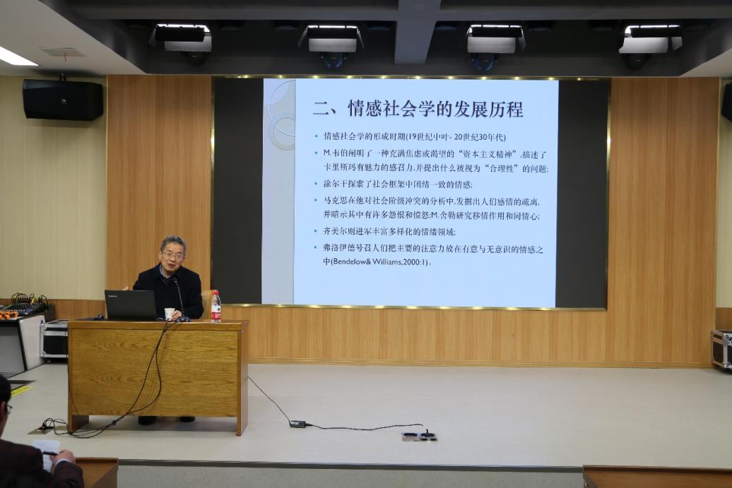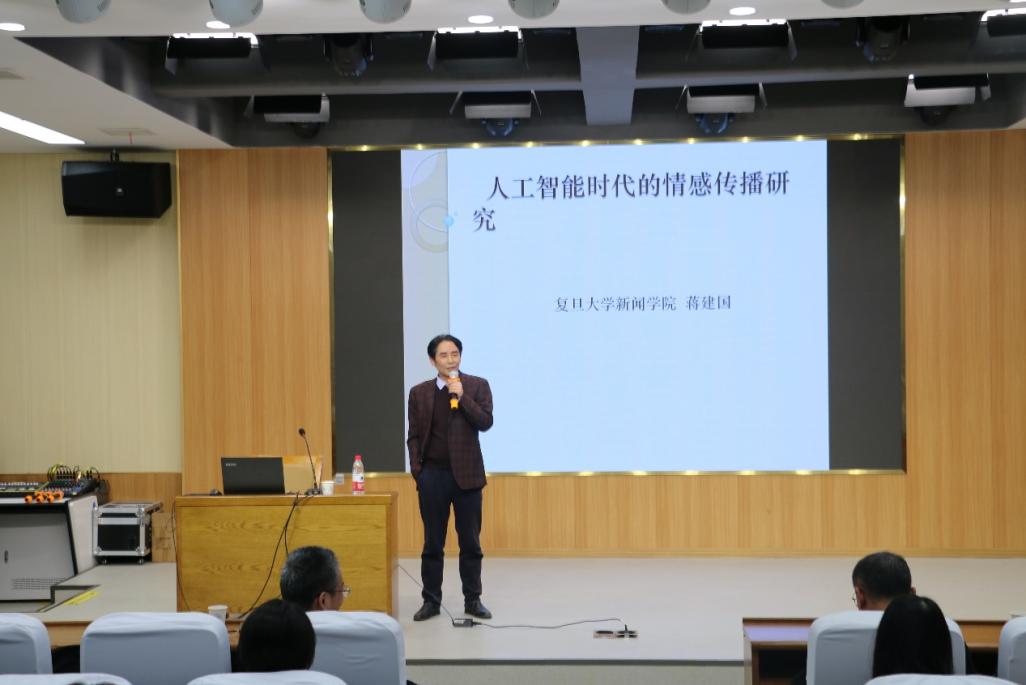 蒋建国教授为在座师生细致的梳理了情感社会学的发展源流,介绍了情感社会学的研究背景和研究内容。他以鲜活的案例,生动的阐述了当代社会的情感研究核心。他指出,在人工智能时代下,网络将工作、消费和社交有机地结合在一起,是人类情感表达最直接、最广泛、最具影响力的空间。网络情感研究的前提,就是要强调人学观点,从信息现象的描述转向于人的情感问题,而网络文化研究的人学意涵,就是要回归到网络情感的核心议题。