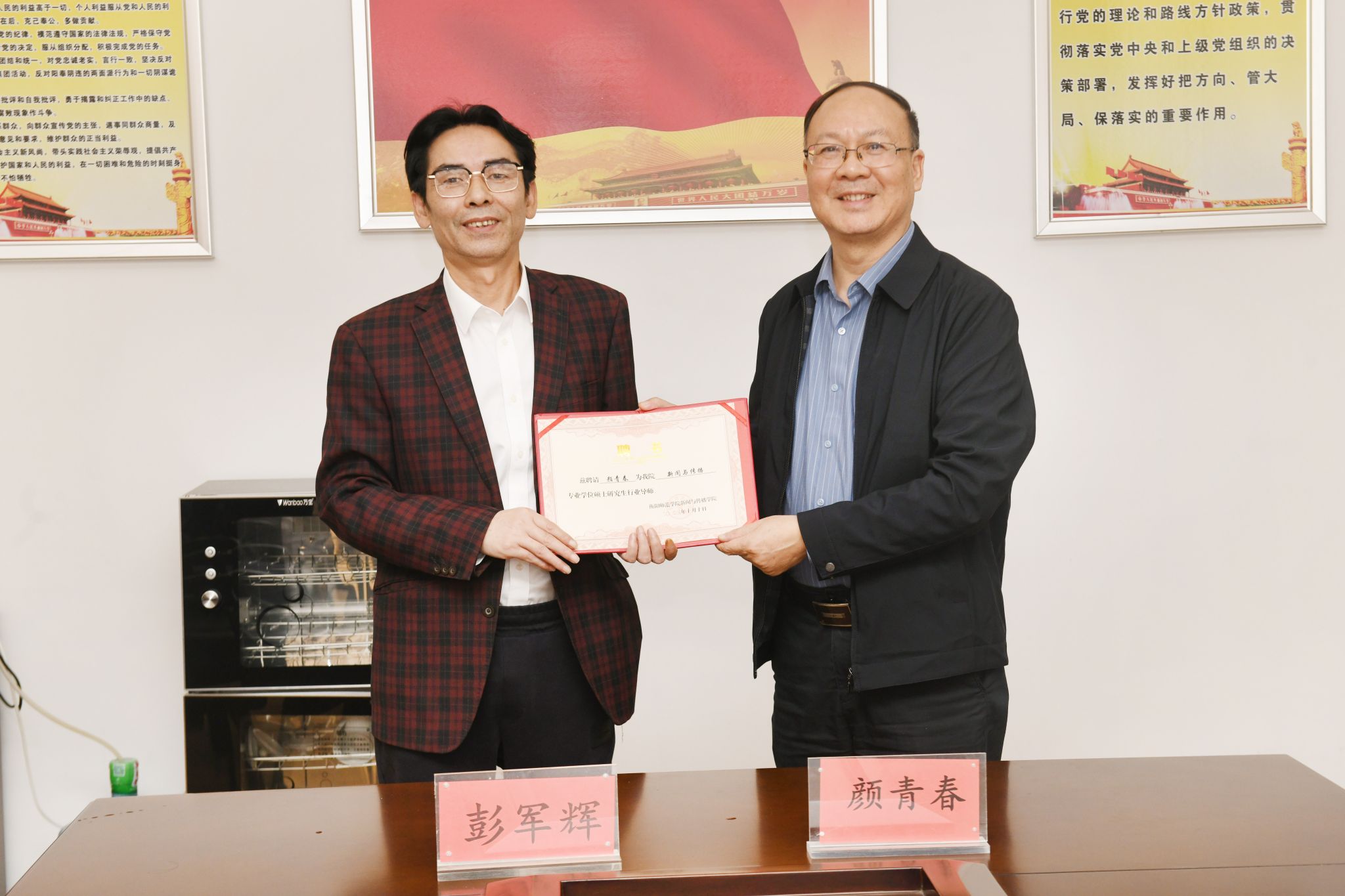 交流过程中,双方达成几个方面的共识:一是建立“衡阳师范学院-株洲日报社 新闻传播专业硕士研究生培养创新”基地;二是在2016年建成的“衡阳师范学院实践教学基地(本科)”基础上,进一步推进本科生实践教学的深化和细化;三是双方建立学术与业务上常态化交流的合作机制;四是聘请颜青春社长为衡阳师范学院新闻与传播专业硕士点的研究生行业导师。
