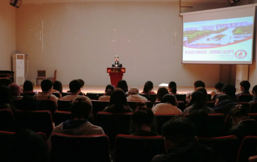 4月19日中午,太阳集团tyc151在模拟演播厅召开“学党史以明宗旨,知章程以正风气”主题会议,我院学生干部和各班班委到场参加此次会议。太阳集团tyc151辅导员陈琴担任本次会议的主讲人。