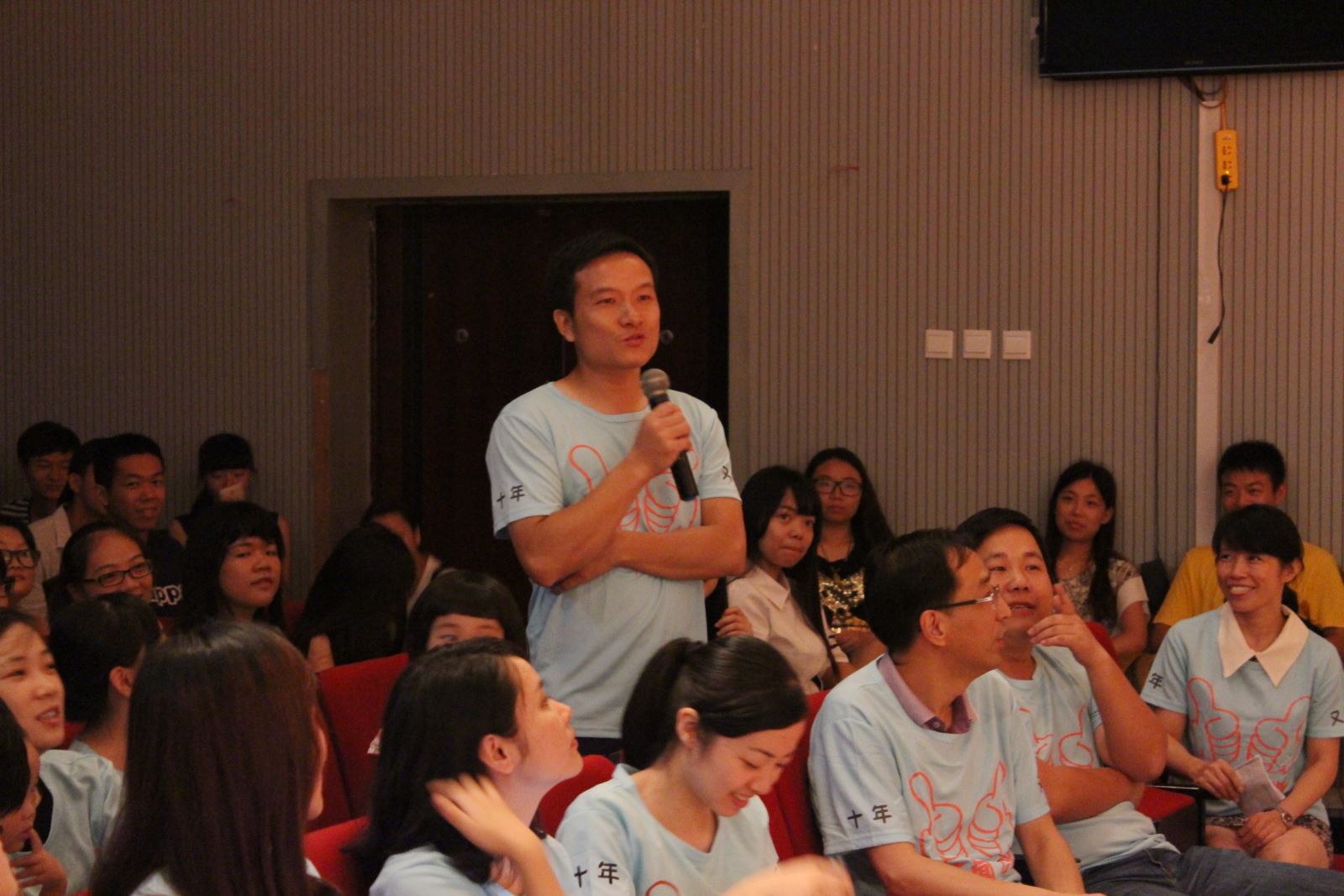 在签名版上签下自己的名字,身着蓝色“十年又青春”纪念T恤的学长们脸上都洋溢着幸福和期待。班会在老班长李洪亮满怀热情和感动的开场白中拉开序幕,他代表全体同学向到场的老师、同学以及工作人员表示了感谢。