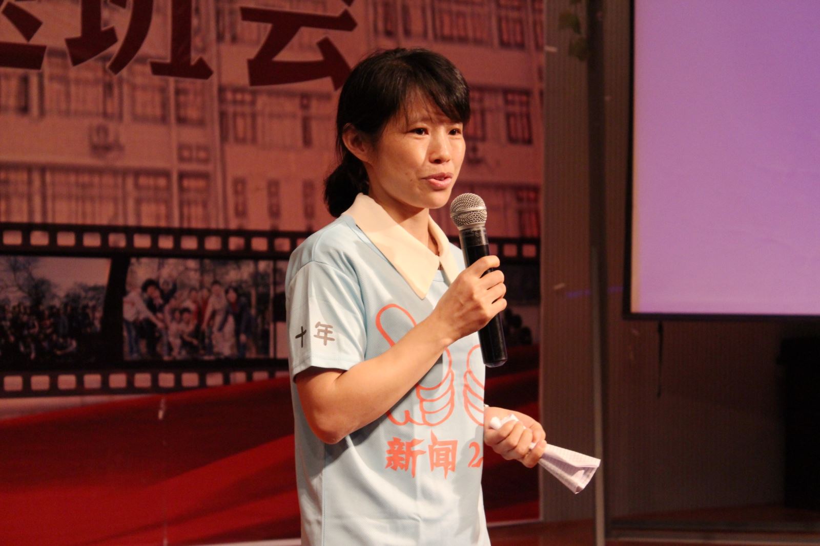 接着,班会上播放了一段充满回忆与感动的视频。视频用老照片的形式将同学们带入往日时光,十年前的记忆如泉水涌般喷薄而出。随后,班主任盛芳老师上台点名,同学们热情的应答让现场仿若回到了十多年前的课堂。盛芳老师表达了开心与愧疚之情,开心的是相聚;愧疚的是当年学识有限,没能带给大家更好的指导,这十年自己与大家一样不断努力共同成长。她还说,一直记得和大家相处的情形,也珍惜从各种渠道了解到的学生信息。同学们感动不已纷纷走上舞台,向盛芳老师鞠躬表达感恩之情并与她深情拥抱。