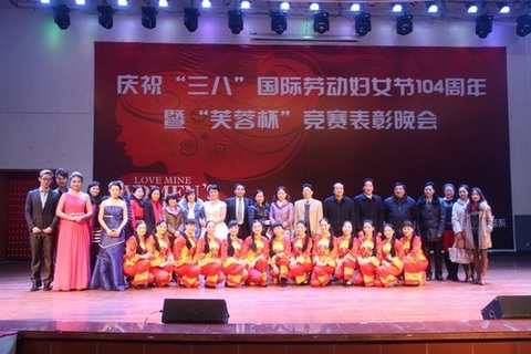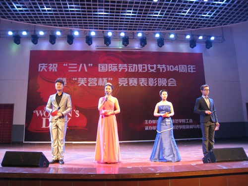 3月6日,学校工会主办、我系承办的衡阳师范学院2014年庆祝“三八”国际劳动妇女节104周年暨“芙蓉杯”竞赛表彰晚会于新校区音乐厅隆重举行,湖南省教育工会女职工委员会主任孙晓红、原我院副院长、工会主席陈杰峰、副院长张登玉、廖北文、李玲玲出席晚会。