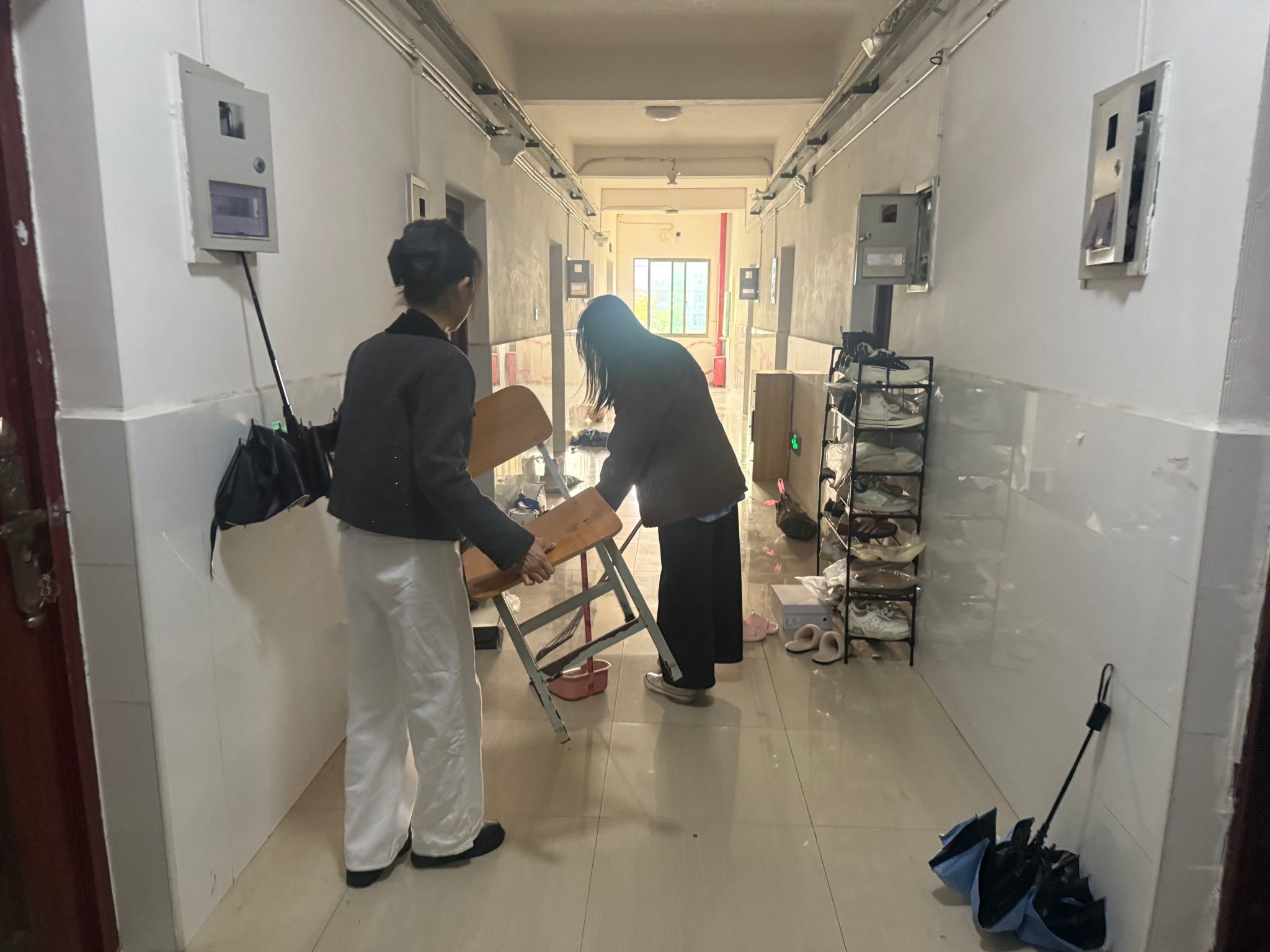 宿舍楼的环境卫生是一项重点内容。检查组既查看地面清洁度,也关注物品摆放规范性。对卫生存在不足的地方立刻进行清理打扫。